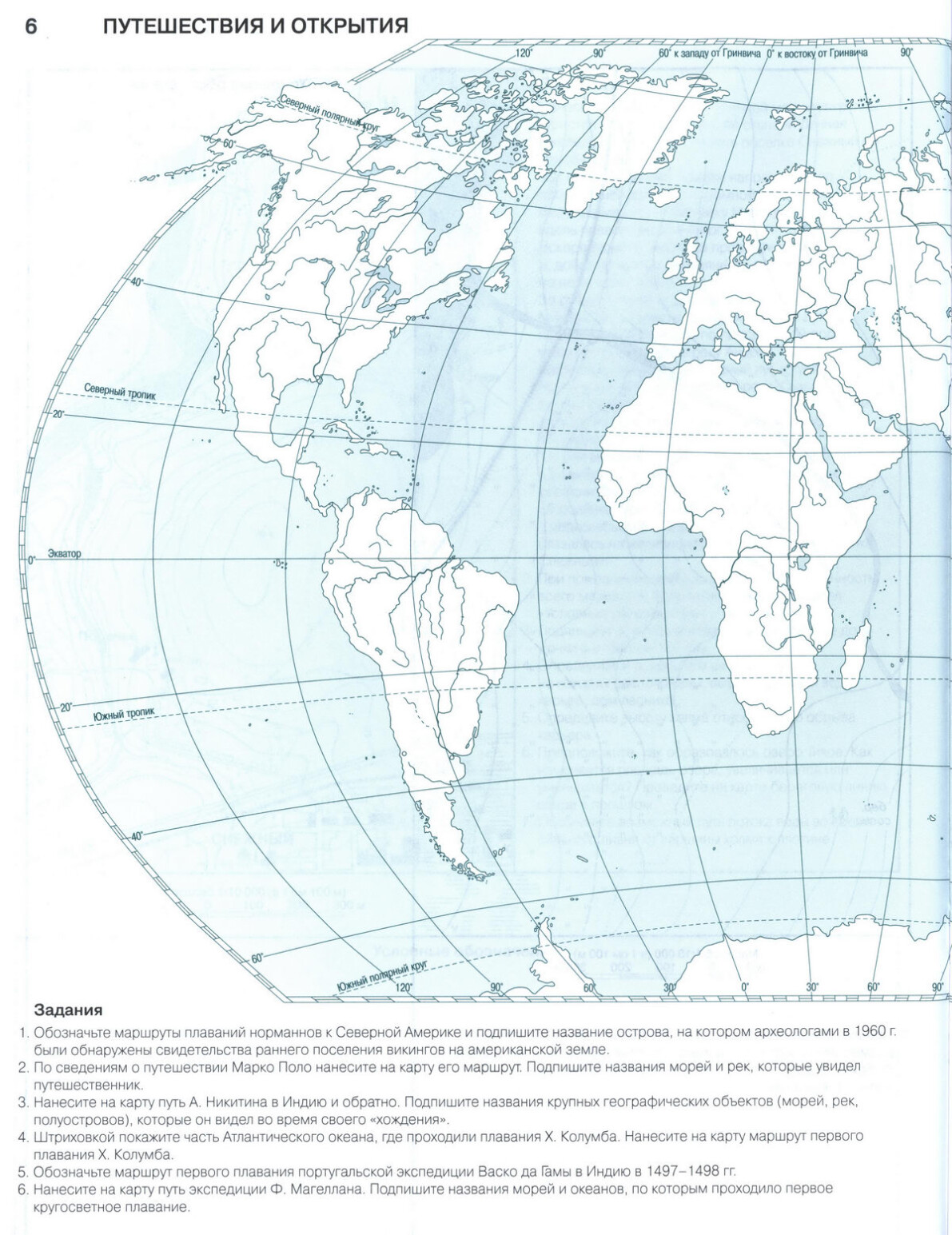 Путешествия и открытия стр 6, 7 Душина, Летягин скачать и распечатать контурную карту 6 класс география