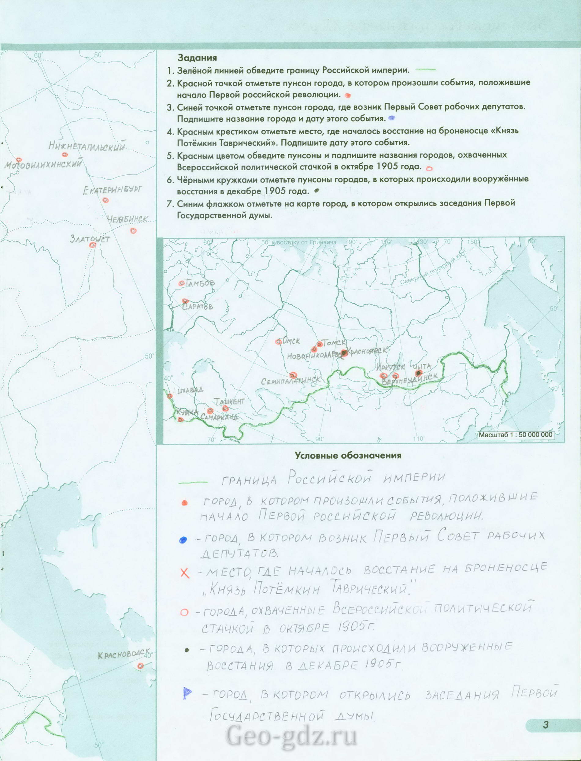 5. Красным цветом обведите пунсоны и подпишите названия городов, охваченных Всероссийской политической стачкой в октябре 1905 года.