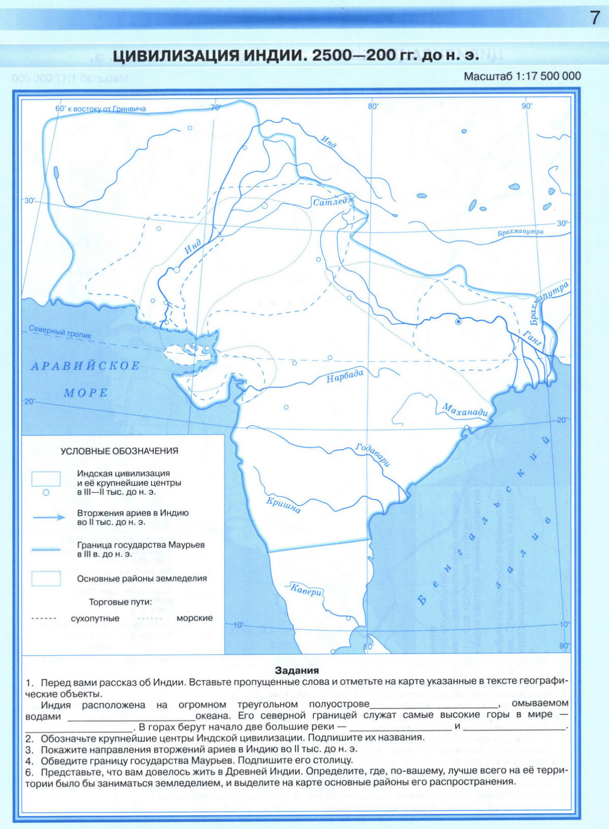 Цивилизация Индии - контурная карта по истории, стр 7, 5 класс Дрофа, скачать и распечатать